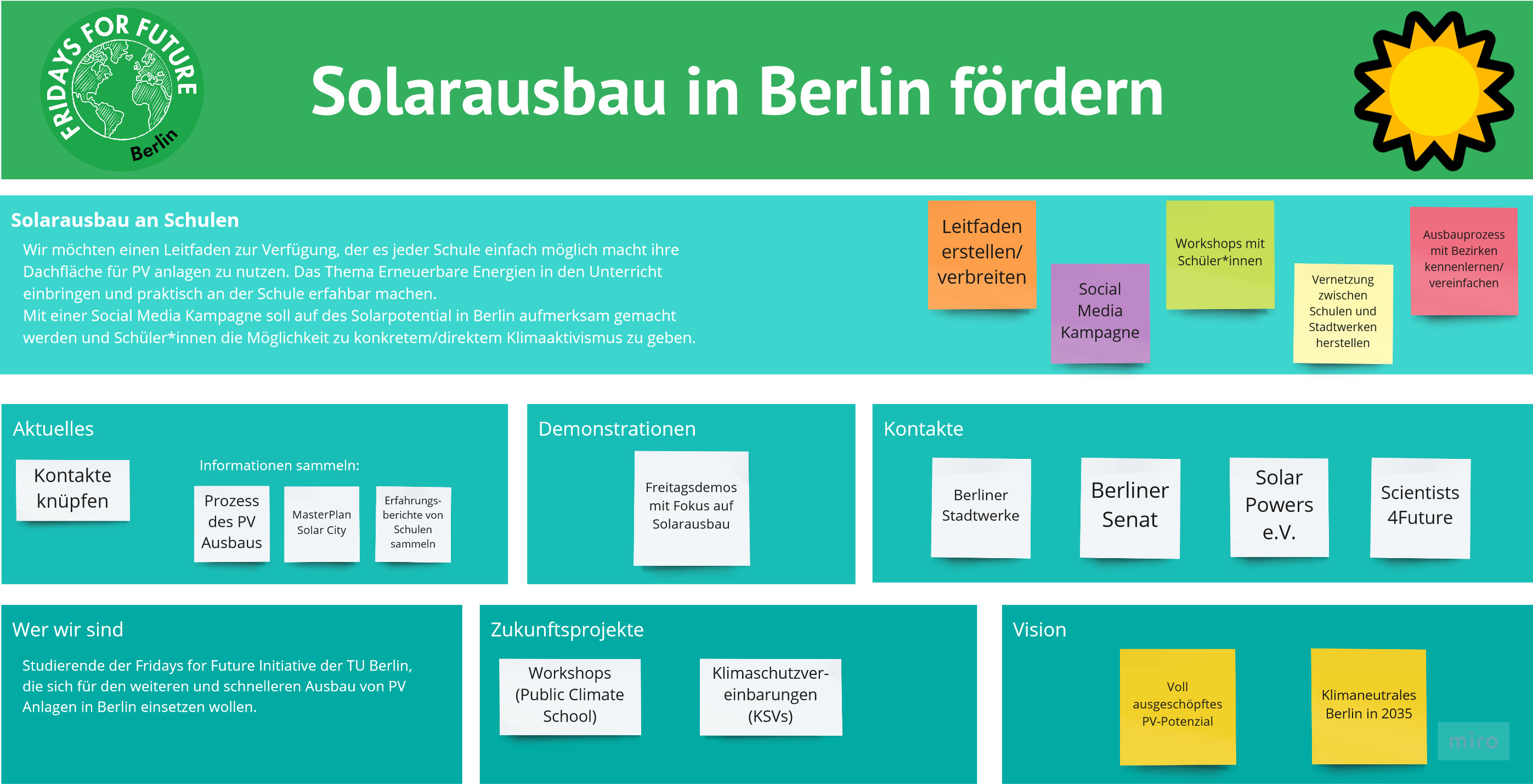 Treffen: Jeden Donnerstag um 19 Uhr auf Discord (falls ihr Interesse habt, bei uns vorbeizuschauen: solar@fridaysforfuture.berlin)