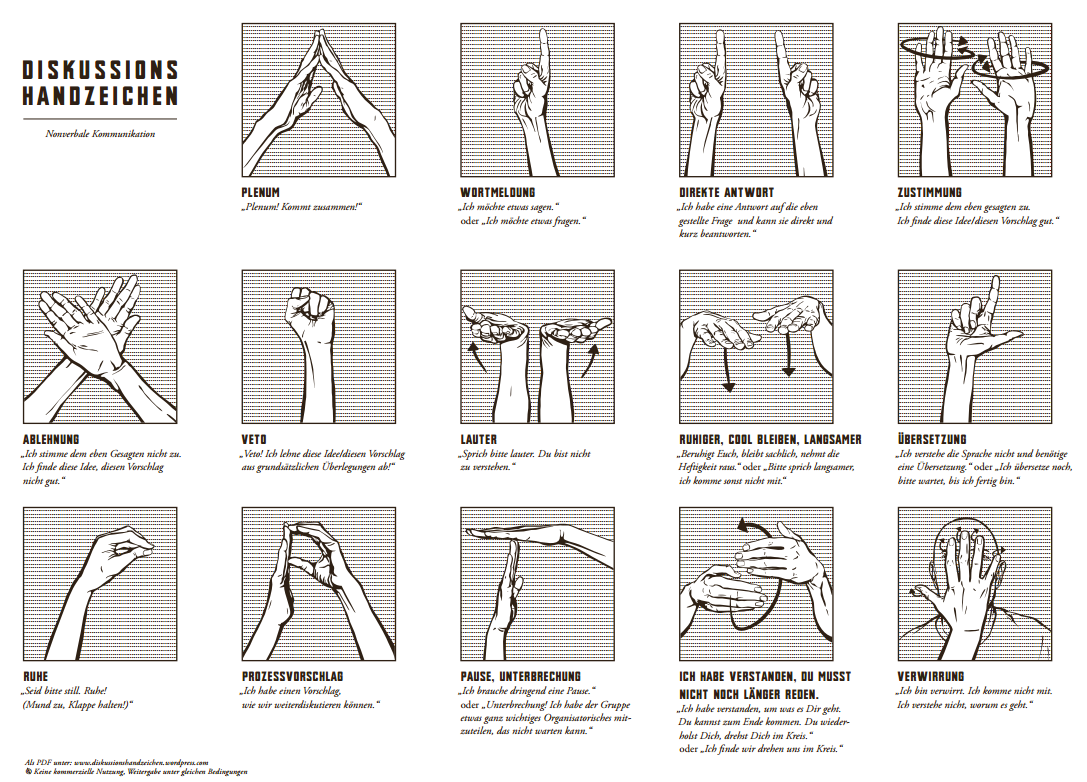 Im Rahmen des Plenums werden zur Diskussions- und Kommunikationsunterstützung Handzeichen verwendet. In der folgenden Graphik seht ihr die verschiedenen Handzeichen und was sie bedeuten.